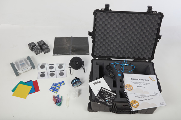 This kit contains a Homestar Flux portable planetarium, a DIY rocket kit with balloon and alka seltzer rockets, four Merge Cubes, and a Sphero RVR robot. The kit also contains an activity guide with a broad range of programs you could run for all ages.