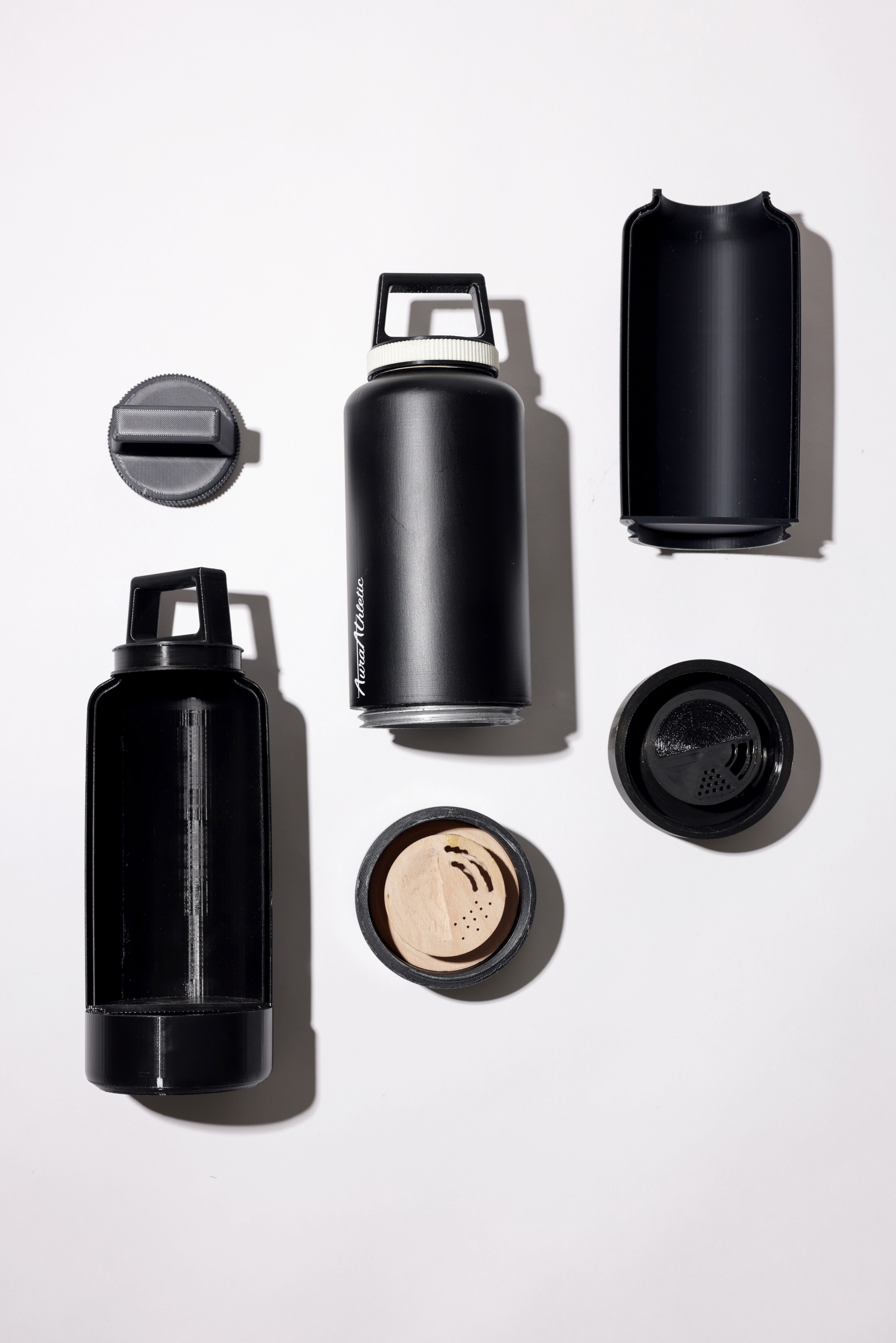 In recreational sports leagues, stressful environments mixed with seemingly limitless extra belongings (such as tape or mouthguards) make game days an opportunity like no other for belongings to be lost. My design brief aimed to combat this issue by putting storage for any extra items in a product that will always be by the player’s side – their water bottle. The storage compartment contains a comfortable location for a mouthguard and also features an insert where players can store their removed jewellery without any worries.