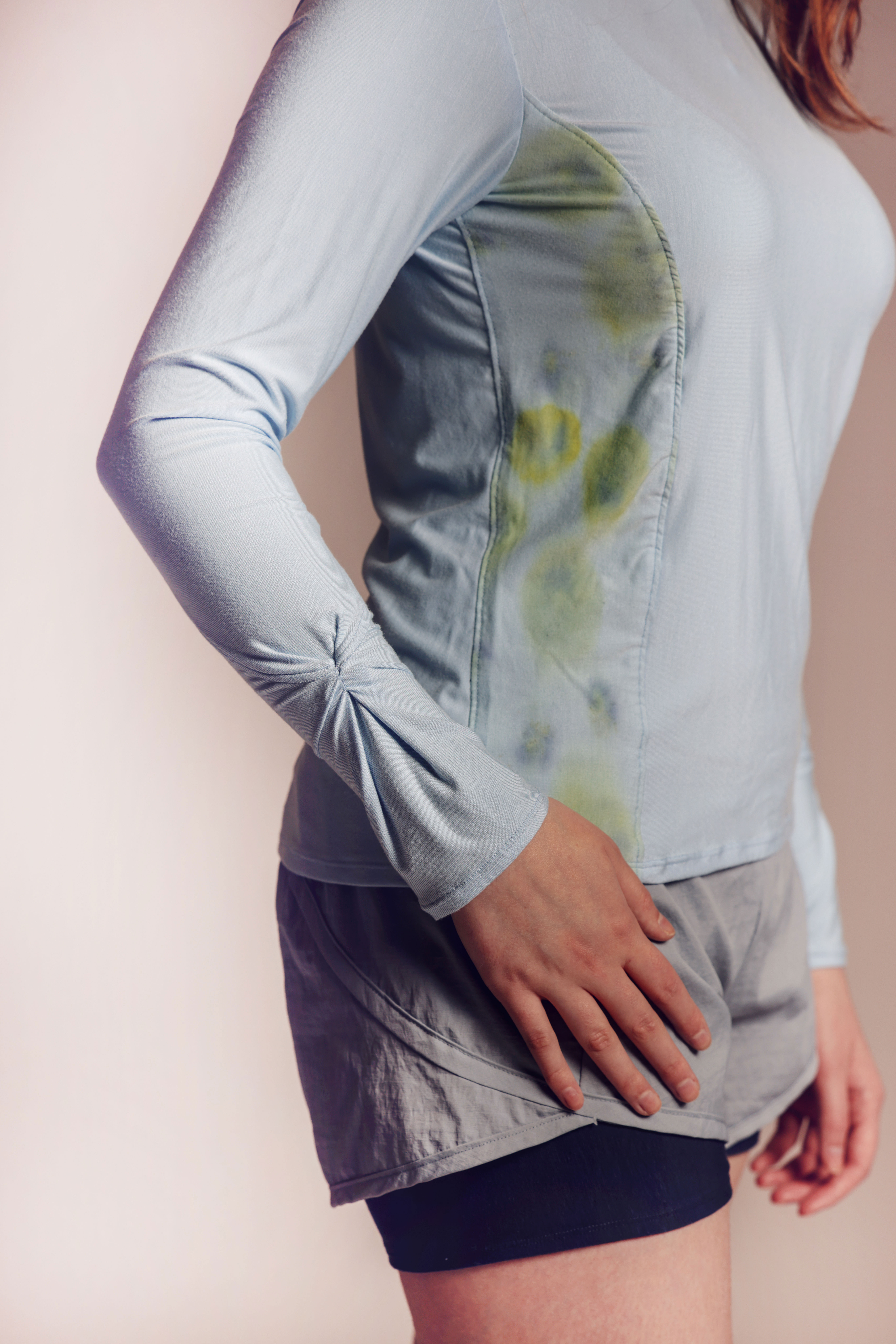 Eco-printed Sportswear explores the relationship between sustainability and physical activity through eco-conscious design. Using high-performance deadstock fabrics and mindful making practices, this sportswear ensemble demonstrates that style and function don't need to be compromised for sustainability. As skin cancer diagnoses are rising, it was essential to incorporate both structural and physical protection against harmful UV rays. Finally, vibrant impressions of Viola and Pansy flowers highlight the beauty of nature, in turn encouraging responsible product stewardship.