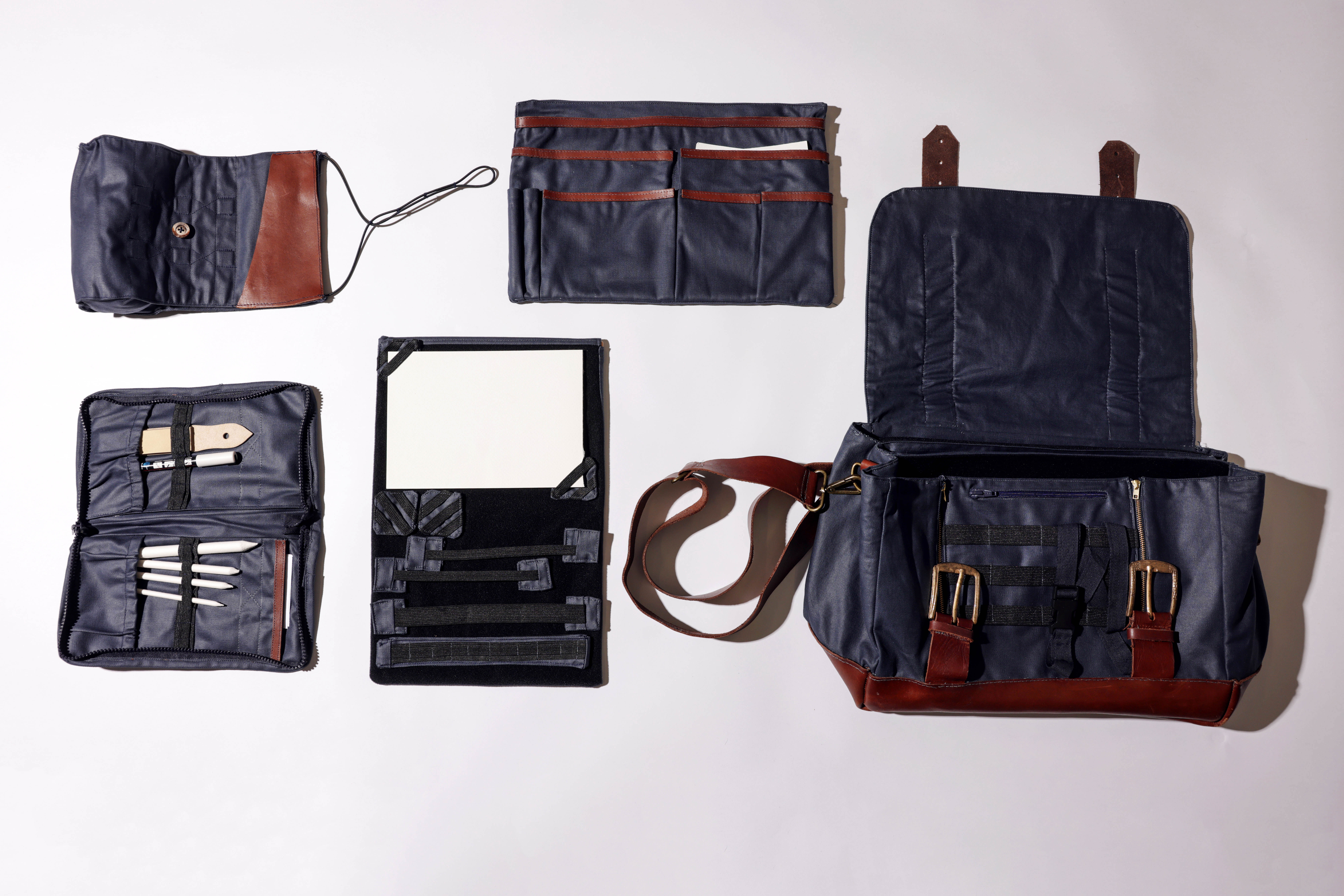 Waxed canvas, leather, Velcro, cotton, brass, magnets, zippers, elastic