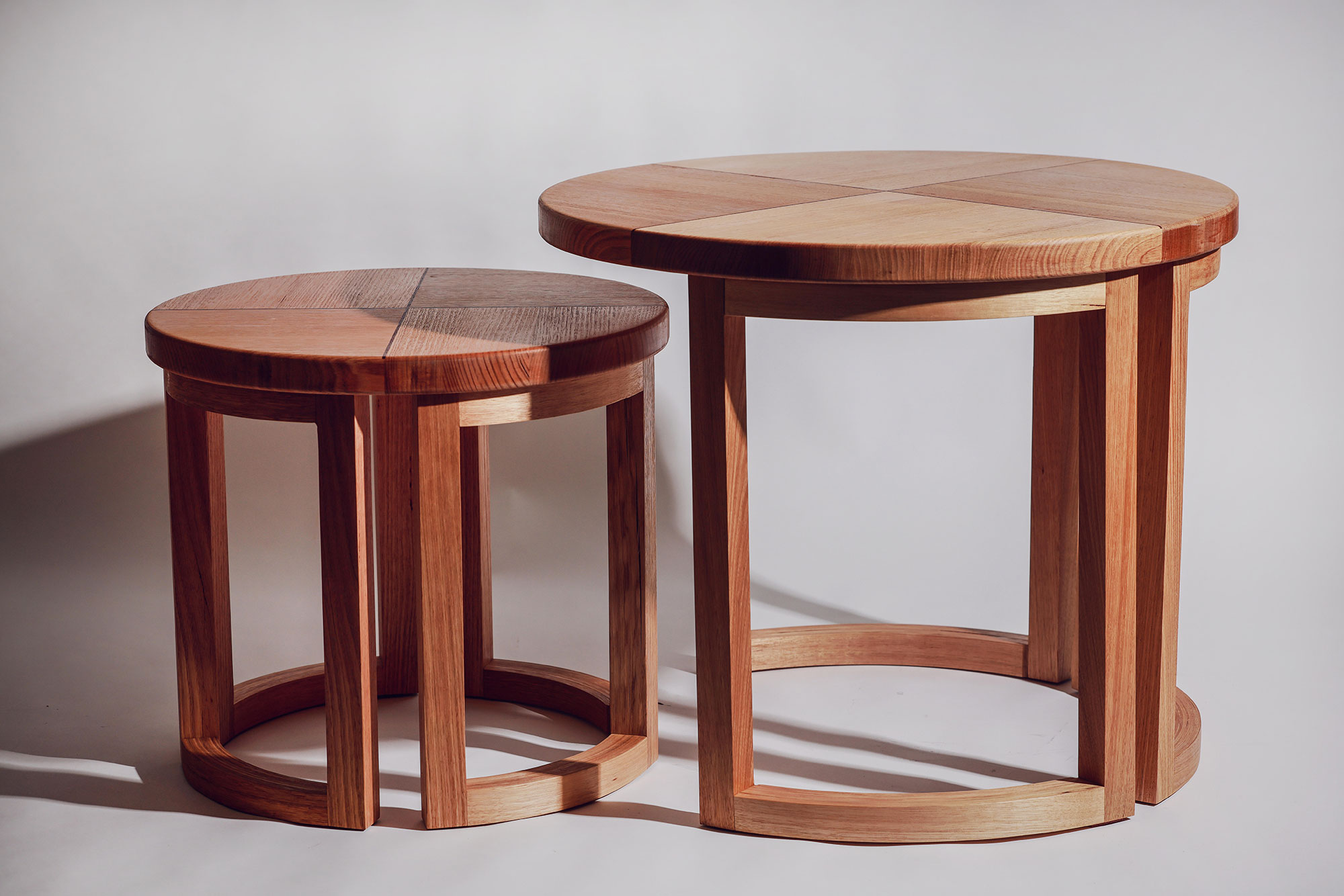 These two round nesting tables showcase a refined blend of craftsmanship and the natural beauty of the materials. Made from Victorian Ash, each piece highlights the timber’s grain and strength, while a contrasting Jarrah inlay adds a striking touch of richness and character. Designed to nest seamlessly, the tables offer both practicality and elegance. Laminations on the rails achieve the curves that follow the round top and a segmented top fitted with biscuits for a strong design.