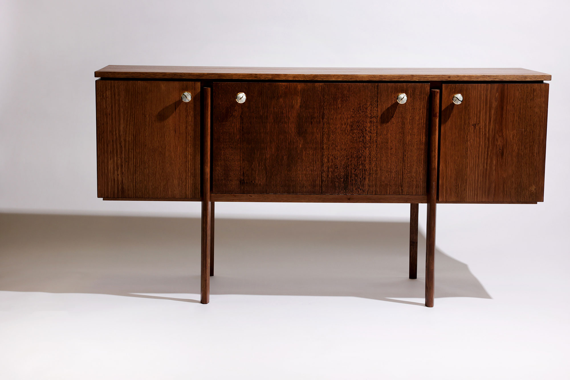 My turntable cabinet is a rectangular piece crafted from Victorian Ash that is stained with rich walnut. Shadow gaps, paired with precise mitre, loose tenon and biscuit joints, create a clean yet intricate design. Its three-compartment layout maximises storage space, while the refined exterior allows the cabinet to be admired from any angle. The classy brass hardware works with the deep brown wood to complement the timeless character of a turntable, serving as a striking centrepiece in any room.