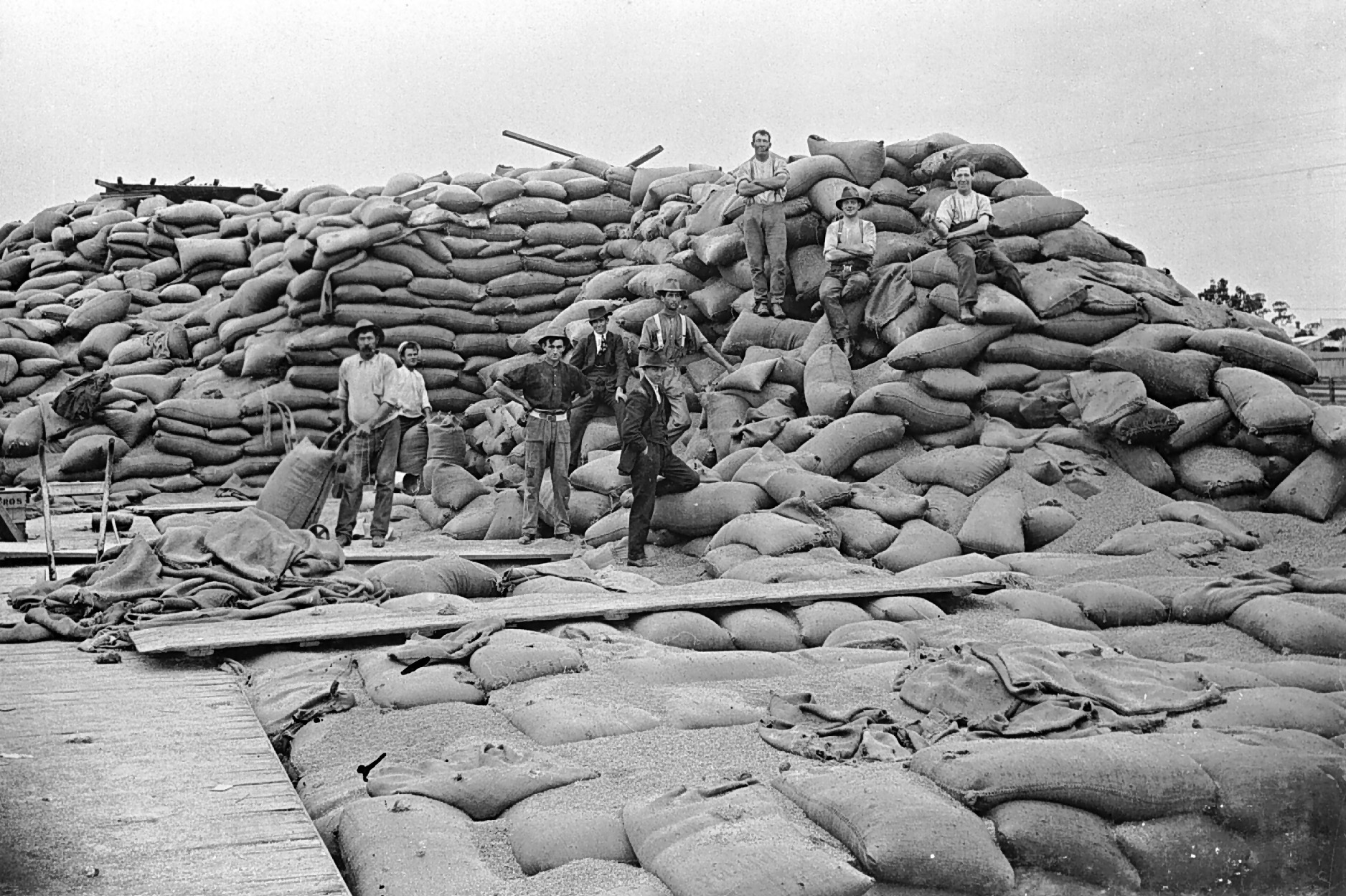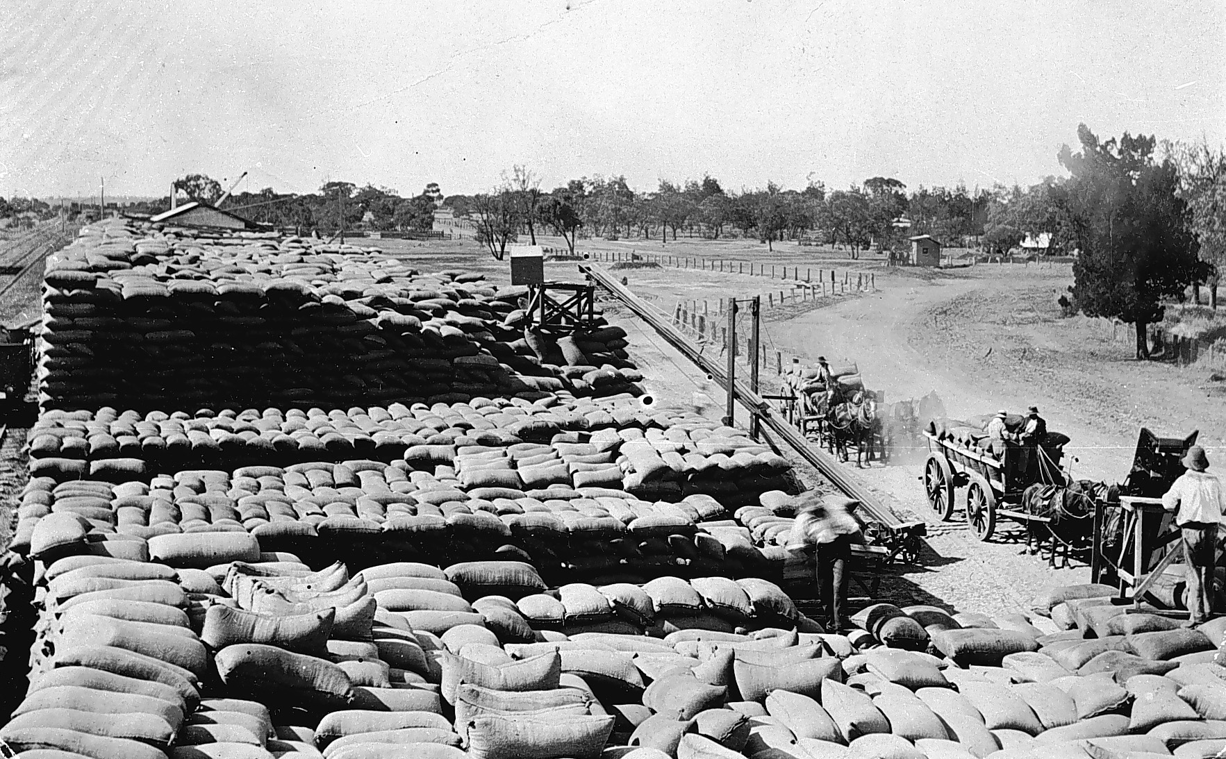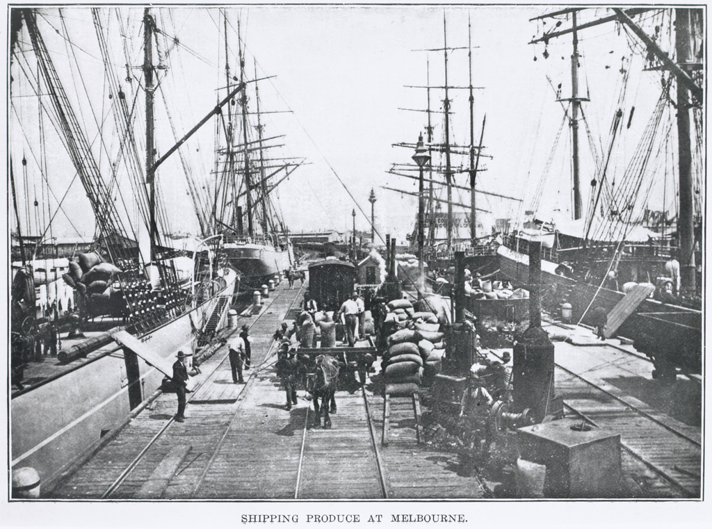 Until the late 1930s all wheat had to be packed into sacks of a size able to be manually handled. Each sack was then individually loaded through the transport chain between field and port. The enormous wheat stacks photographed at railway sidings during the early twentieth century are impressive not only for their bulk but also the amount of human labour required to build and then disassemble them. A mobile workforce of casual labourers handled the annual wheat crop at both the rural railyards and the Melbourne docks.