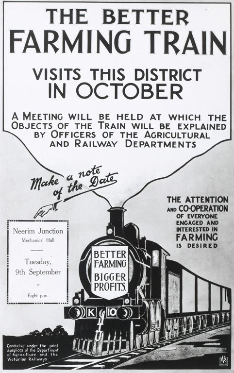 One of the best illustrations of the important role railways played is the Centenary-Jubilee train which travelled the state in 1951. Eleven carriages contained a diverse touring exhibition, including paintings from the National Gallery, models of gold mining history, diagrams of the Snowy Mountains Hydro-Electric scheme and an outline of railways history, which was viewed by over half a million people. Earlier in the century the Better Farming Train had travelled the state to educate rural communities about new farming technologies.